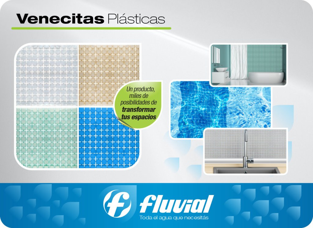 Fluvial presenta las Venecitas Plásticas. Un novedoso producto con múltiples aplicaciones. Ideales tanto para el revestimiento de piscinas como cocinas, baños y otros ambientes interiores y exteriores.